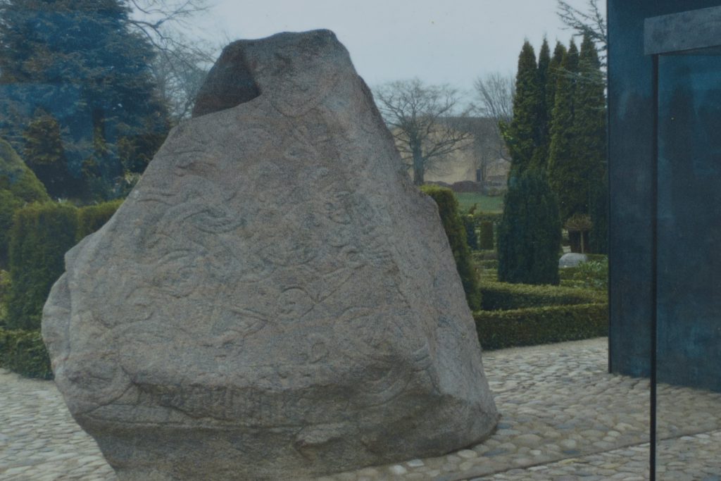 Nadat we ons hebben opgefrist gaan we fietsen richting Jelling. Daar gaan we de Runenstenen van Jelling bekijken. Nu staat hij in een groot vitrine ter bescherming van mensen handen en de lucht. De rune inscripties van 20 jaar geleden zijn bijna niet meer te zien (foto 1, 2 + 3). Het schijnt dat de steen het grootste monument is uit de Vikings tijd.
