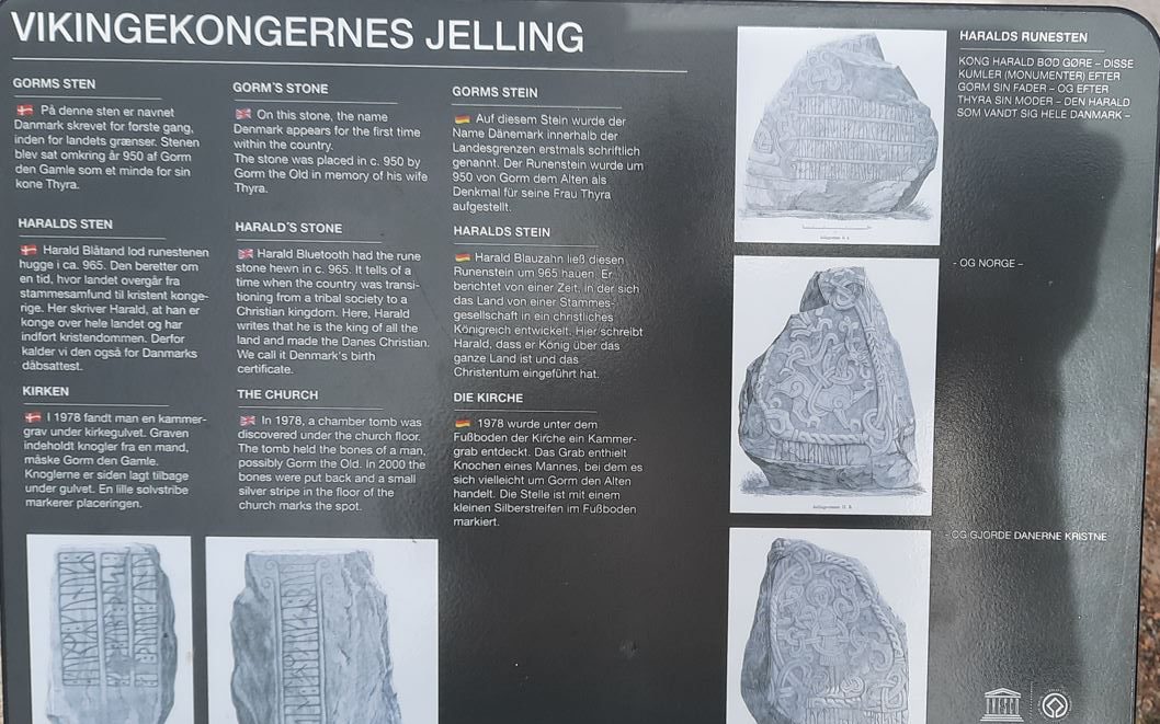 We zien nu dat er nog meer te zien is over die tijd. Er zijn twee grote grafheuvels, King Gorm en zoon Harald. Een kleine eenvoudige kerk van witgekalkte steen.