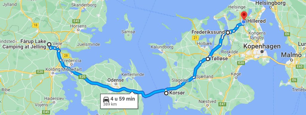 Via de Vejlefjordbrug verlaten we Vejle om naar de brug te rijden bij Nyhave Huse om daar over de Kleine Beltbrug naar Funen te rijden. Om vervolgens naar Nyborg te rijden om daarover de Grote Beltbrug te rijden richting Korsør. Wat een mooi uitzicht. Voor de Grote Beltbrug moet je tol betalen. Vervolgens rijden via de E20 naar Sorø, nemen dan de 57 richting Tølløse om daar via de 53 naar Englerup en Fredrikssund te rijden. Om vervolgens via de 6 naar Hillerød te gaan (foto 4).