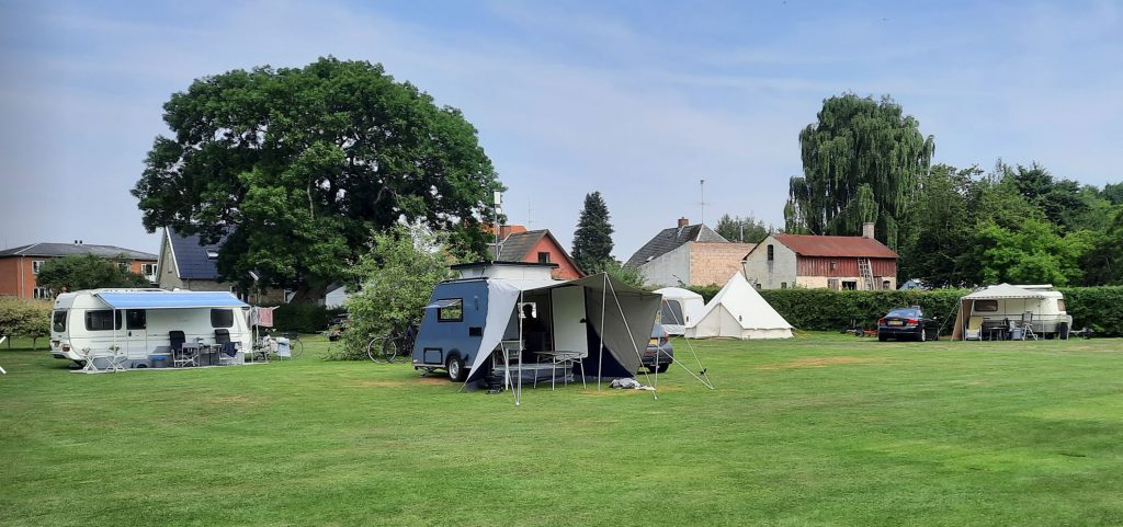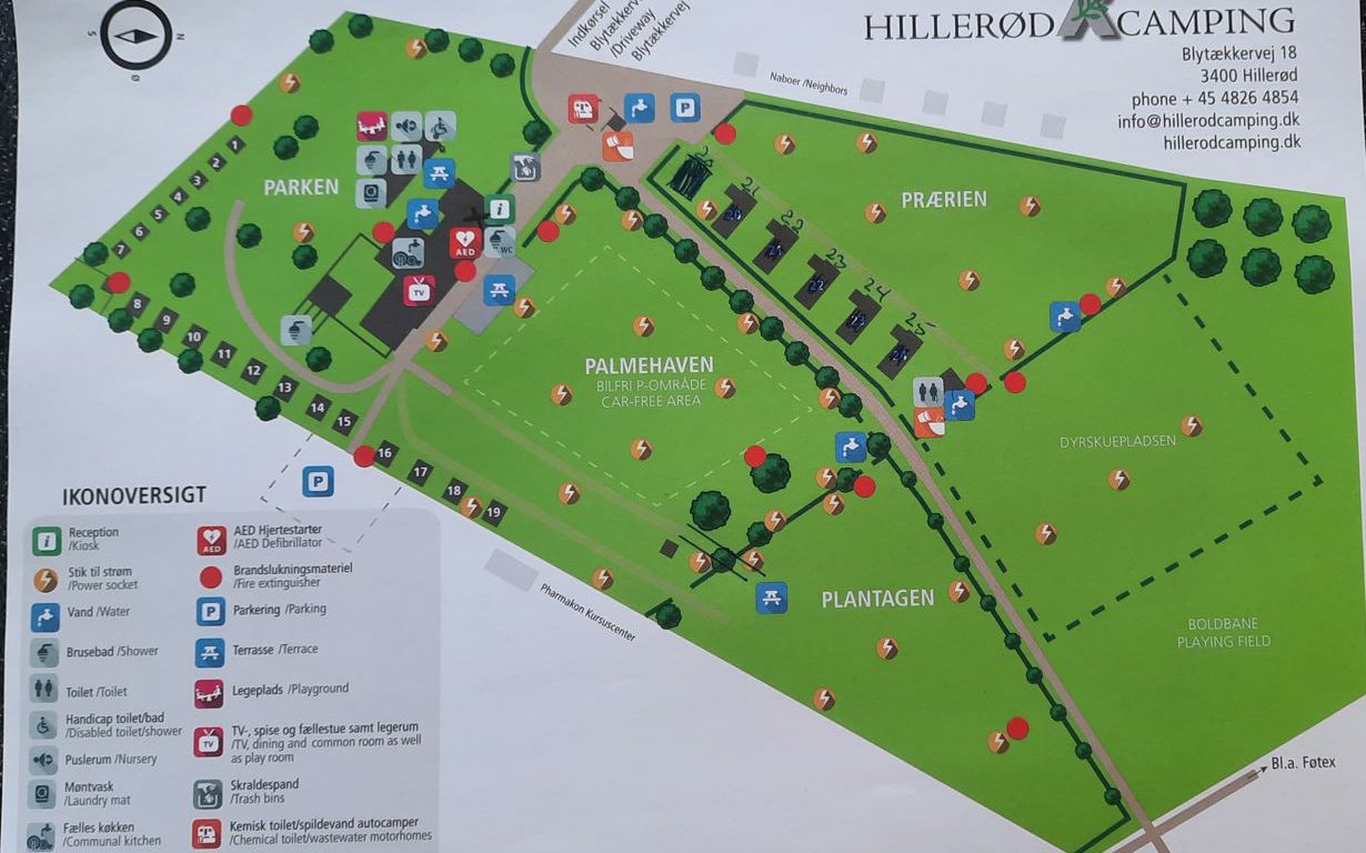 Camping Hillerød ligt midden in het stadje aan een doodlopende weg. Als we arriveren vragen we of er plek is, want we hebben niet gereserveerd. Eerst krijgen we NEE te horen, maar als we navraag doen bij de eigenaresse Annette is er toch plek. Zij wijst ons een plek aan op veld Plantage (foto 5 + 6). Tussen de camping door is een fietspad, dus bij oversteek naar het toiletgebouw goed naar links en rechts kijken.