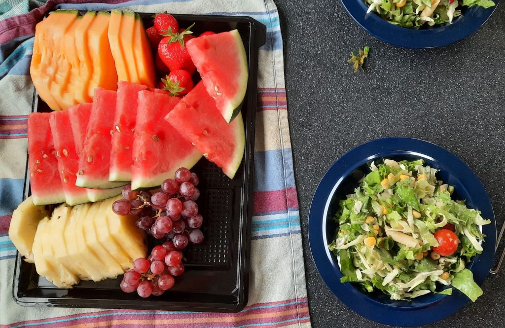 Na afloop nog even naar de Føtex voor boodschappen; kant-en-klaar gesneden sla, grote bak fruit gevuld met ananas – watermeloen – honingmeloen – aardbeien – druifjes en wat zoutjes.