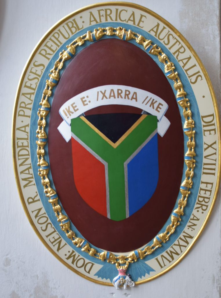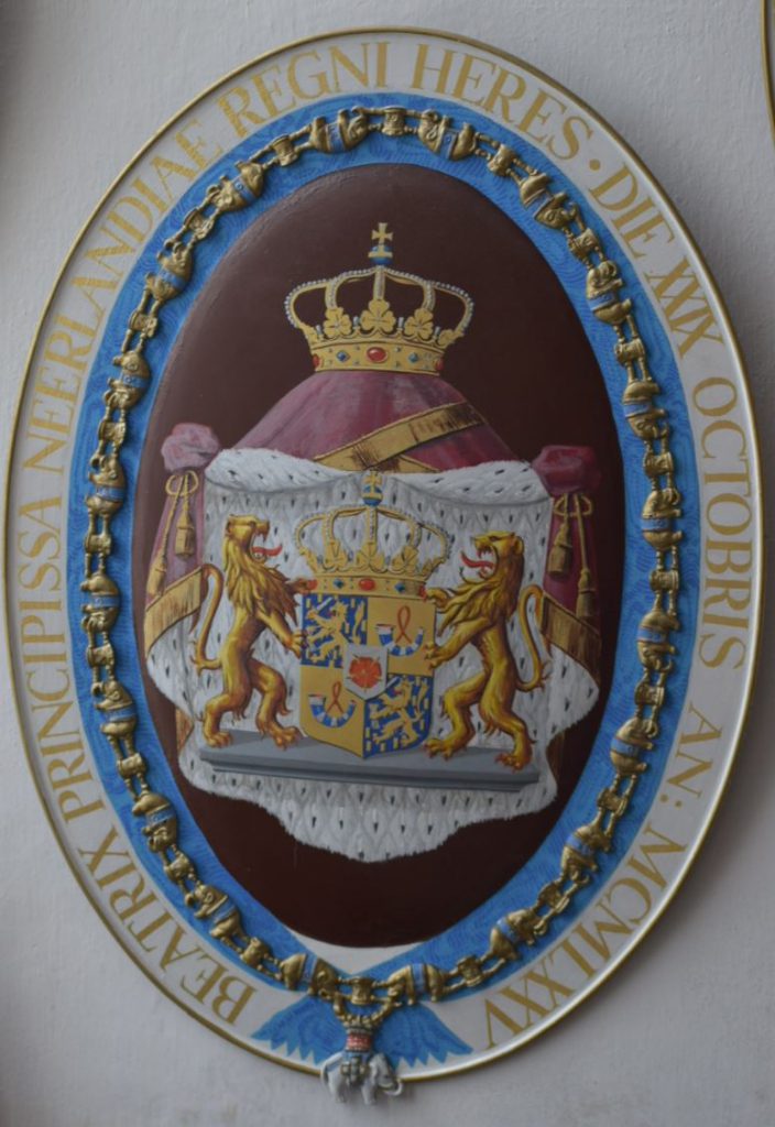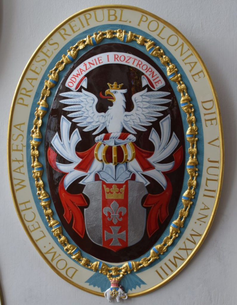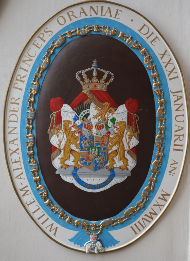 We kopen 2 kaartjes en lopen het slot in. Via een grote zaal gaan we met een wenteltrap naar boven, aan de muur zijn allerlei schilden bevestigd. Dan komen we via een smalle deur in een prachtige kerk terecht. En ik (Miriam) krijg dan het gevoel dat we hier al eerder zijn geweest. Dit uitzicht heb ik volgens mij al eerder gezien? En dan de vraag, zijn we hier dan al eerder geweest? We weten het niet. Ook in deze zaal hangen verschillende schilden. We zien dat er verschil is, bij sommige is er een olifant of een kruis onderaan geschilderd. Op de schilden staat het wapen waarbij de persoon hoort. Zo is het kruis voor priesters/ dominees en de olifant voor Staatshoofden. Zo zien we die van Nelson Mandela (foto 5), Lech Walesa (foto 6) maar ook die van Koningin Wilhelmina (foto 7), Prins Claus (foto 8), Prinses Beatrix (foto 9) en Willem-Alexander (foto 10).