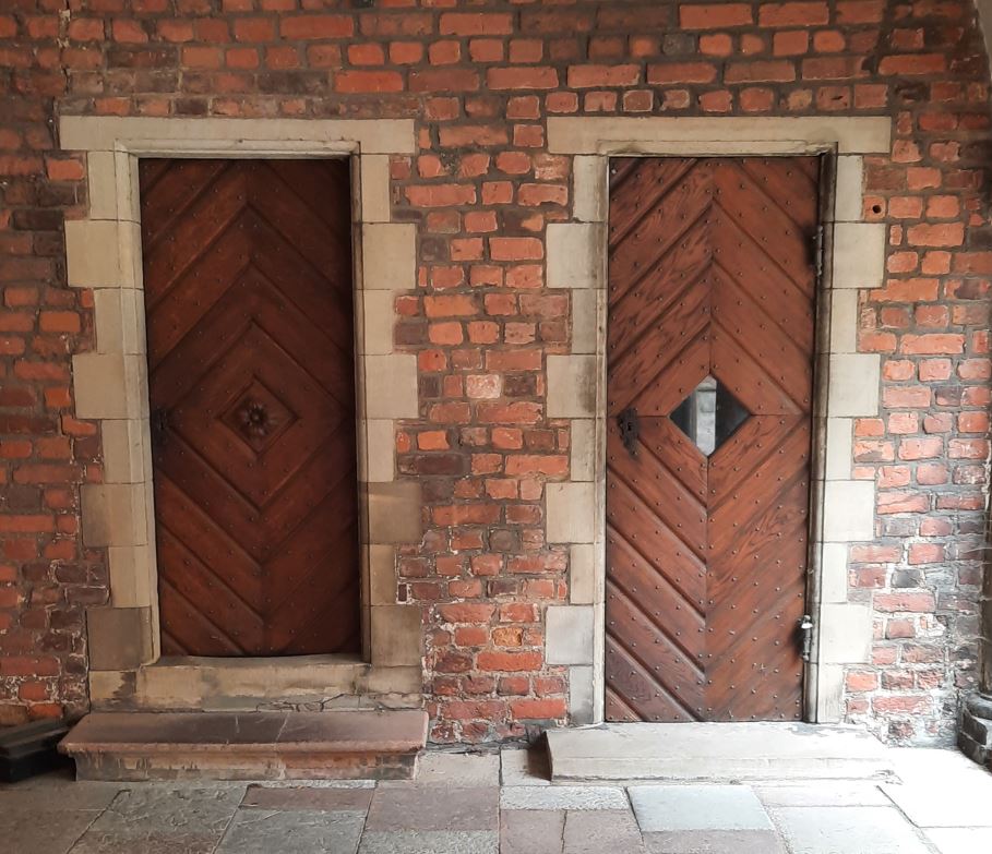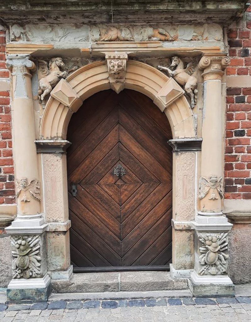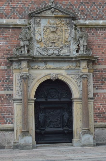 Vandaag gaan we op de fiets naar Frederiksborg kasteel dat vlak in de buurt is. We stappen op de fiets en rijden de camping en de weg af. Tijdens het fietsen bedenkt een van ons dat er werd gezegd dat het 5 minuten lopen is van de camping, terwijl wij al 10 minuten op de fiets zitten. Dus even kijken op de route en we fietsen de verkeerde kant op. Het staat voor de helft in de steigers omdat ze het aan het opknappen zijn. We zetten de fietsen op slot en lopen door de poort naar de binnenplaats. De stenen op de vloer liggen in een mooi patroon en rondom vind je verschillende deuren, de een nog mooier dan de andere (foto 1 t/m 4). Foto 4a is de vergroting van de deur van foto 4.