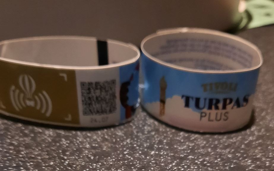 We gaan vandaag reizen met de trein. (foto 1). Het is 10 minuten lopen naar het station Hillerød vanaf de camping. Daar kopen we een enkeltje voor 2 personen naar Kopenhagen. Als we daar het stationshal uitlopen staan we gelijk voor de ingang van Tivoli (foto 3). We hoeven niks te betalen bij de ingang want we hebben vrijkaarten voor entree en speciale attracties die we van ons neefje Jakob gekregen hebben. We dragen plastic armbandjes en worden gescand als dat nodig is (foto 4). Omdat het spookhuis pas om 16:00u opengaat zijn we bijna de hele dag in Tivoli aanwezig. En wat hebben we genoten! Rond 18:00 lopen we terug naar het station, kopen nogmaals een enkeltje (foto 5) voor de terugreis.