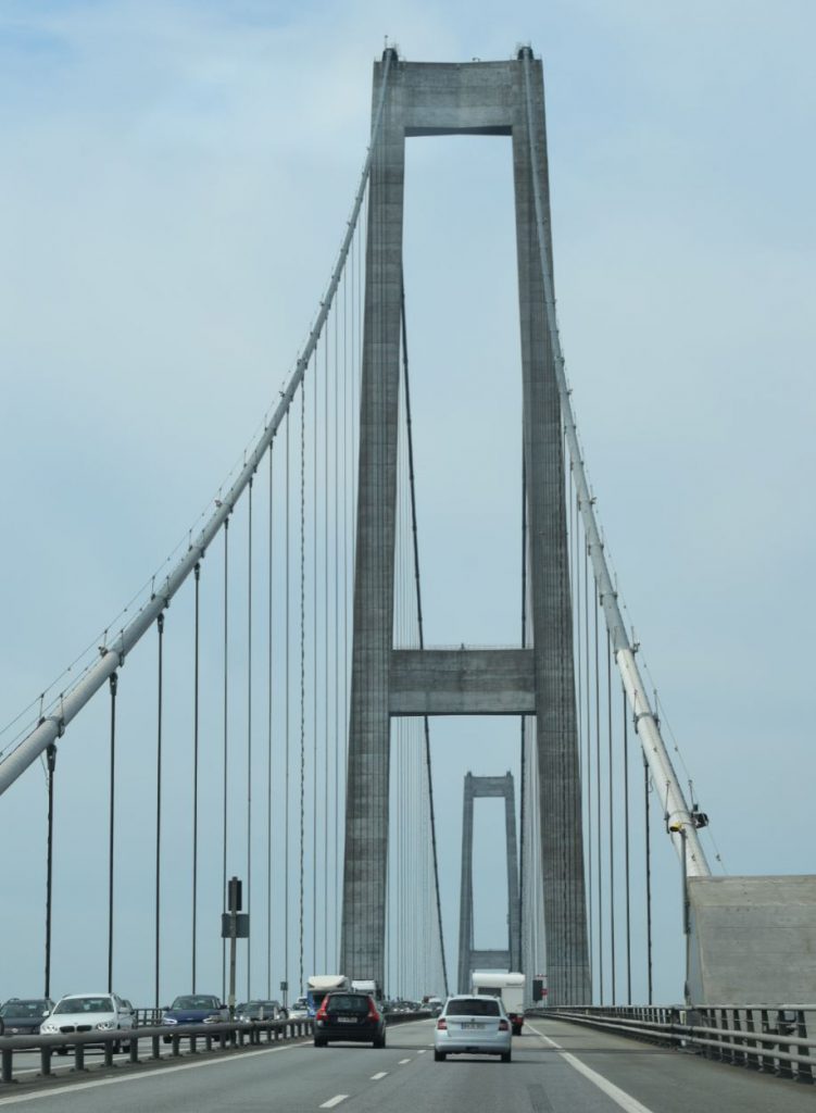 We rijden weer op de kaart terug richting de grote Beltbrug (foto 4 + 5). Voor de brug staan we in de file om door de tolpoortjes te gaan. En dan opeens begint onze rij te rijden, blijkt dat onze hefboom open staat. Dus daar maken wij ook snel gebruik van en rijden snel de brug op.