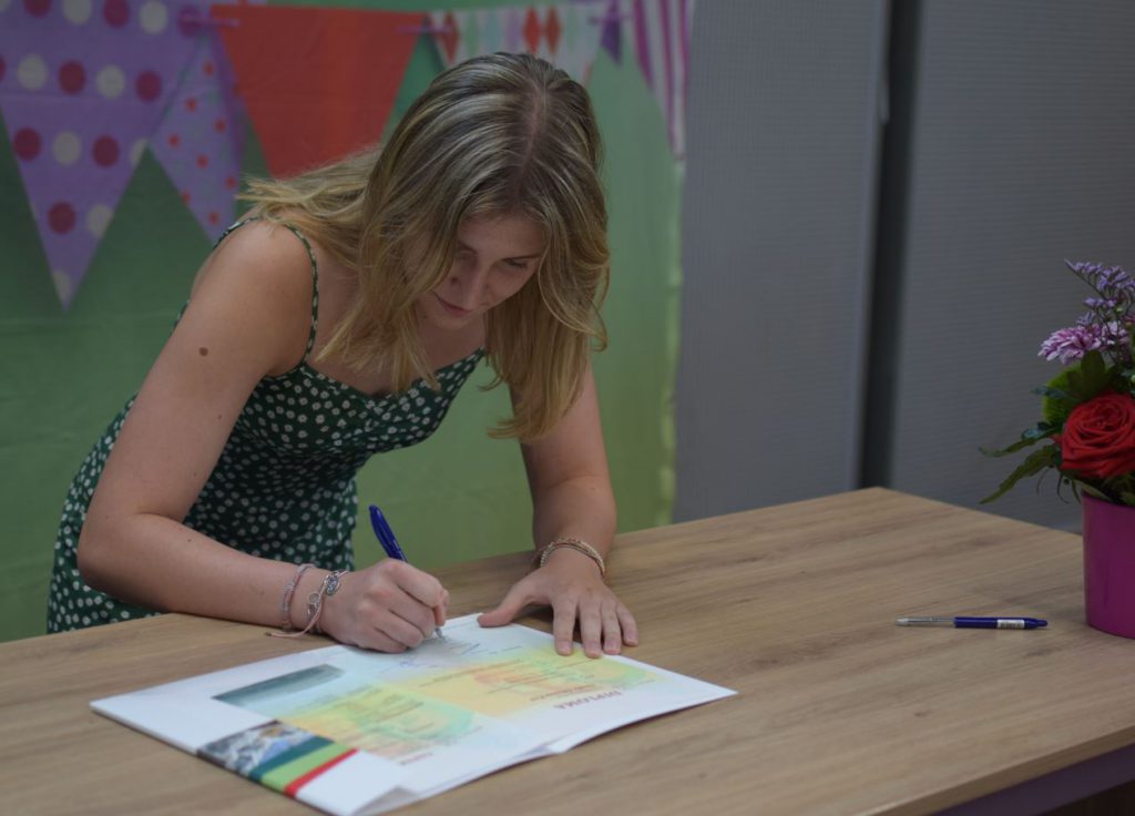 De klas van Nienke heeft twee mentoren, om beurten en soms per twee wordt je naar voren geroepen en wordt er iets korts over je verteld. Dan is het tijd om je handtekening op je diploma te zetten. Na afloop wordt er nog een groepsfoto van de klas gemaakt.