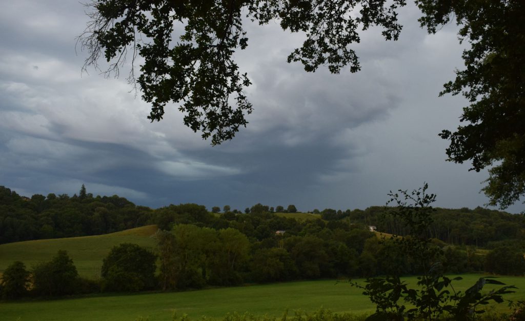 Op de terugweg wat gedronken bij een bistro, wel €3,- per blikje cola. Bij de supermarkt slaan we eten in: groenten (bataat, champignons, komkommer, wortels, broccoli, ‘zwart radijs’ en uien) hamburger, melk, wijn, chips, kaas, brood. Rond 21:30 begint het te rommelen, onweer opkomst. We zien de rolwolken verschijnen en boven de bergen de schichten gaan. Totdat het ook boven de camping komt. Vanuit de caravan een mooi uitzicht, net een film. Dan breekt de boel los en komt het met bakken uit de lucht. De onweer stopt pas om 01:30 en dan pas val ik in slaap.