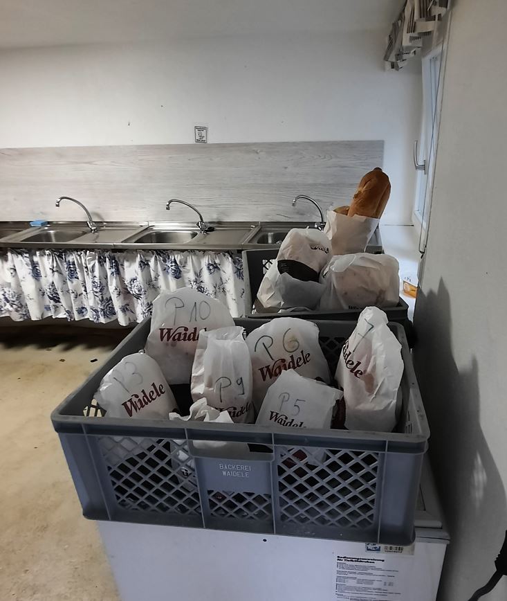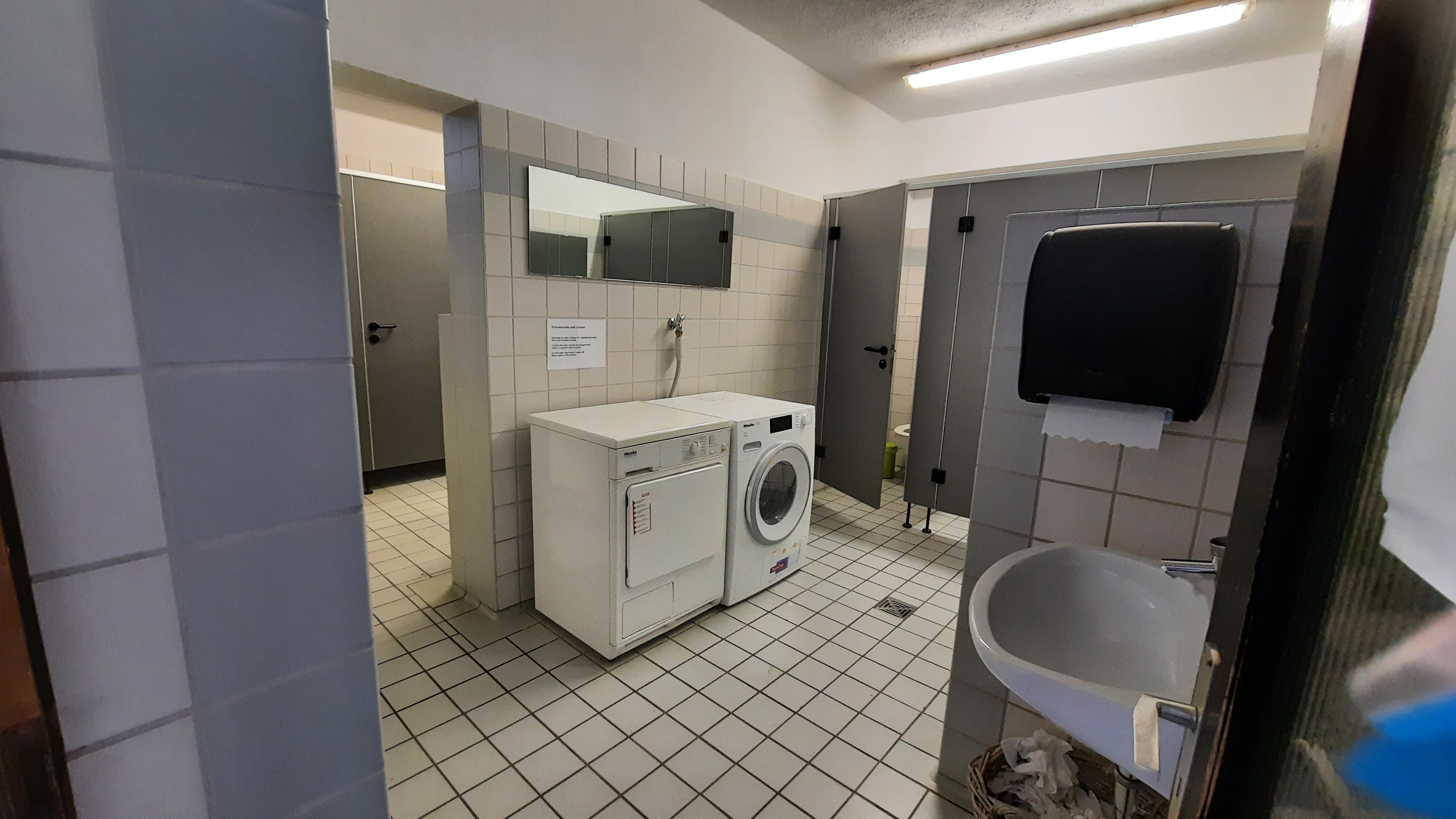 Ja, voor het douchen betaal je 50 cent voor 4 minuten. Maar eerst een muntje scoren en dat is zelf niet zo makkelijk. Wel kleingeld van thuis mee, maar net geen €0,50 en ook het wisselbakje is leeg. Dus leuren bij de buren, gelukkig had net iemand een aantal muntjes gescoord in het dorp Wolfach. De vrouwen en de mannen hebben ieder een eigen afdeling, 3 toiletten en 3 douches. De douche is voorzien van één (regen)kop en gelukkig ook een stop/ startknop om je in te zepen. Muntje erin en een campingdouche nemen. De temperatuur en de straal is precies goed, dus voor dit onderdeel krijgen ze een ++.