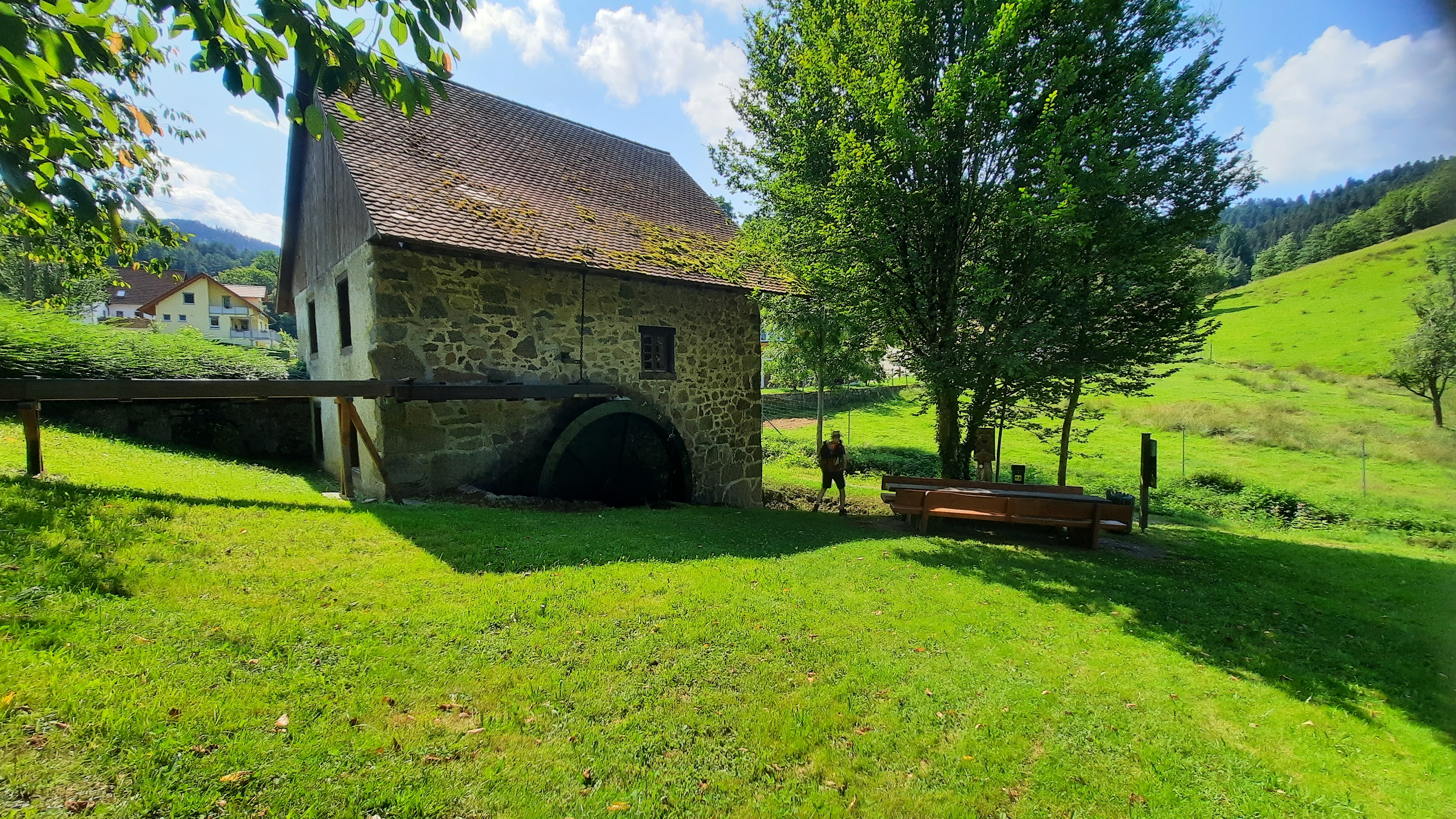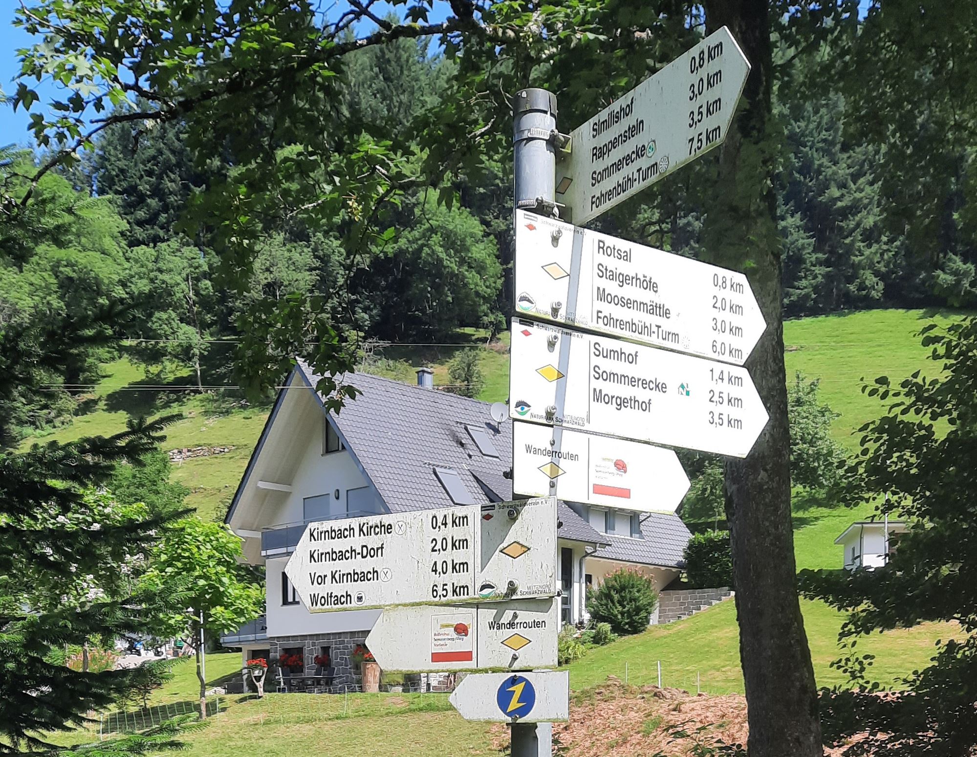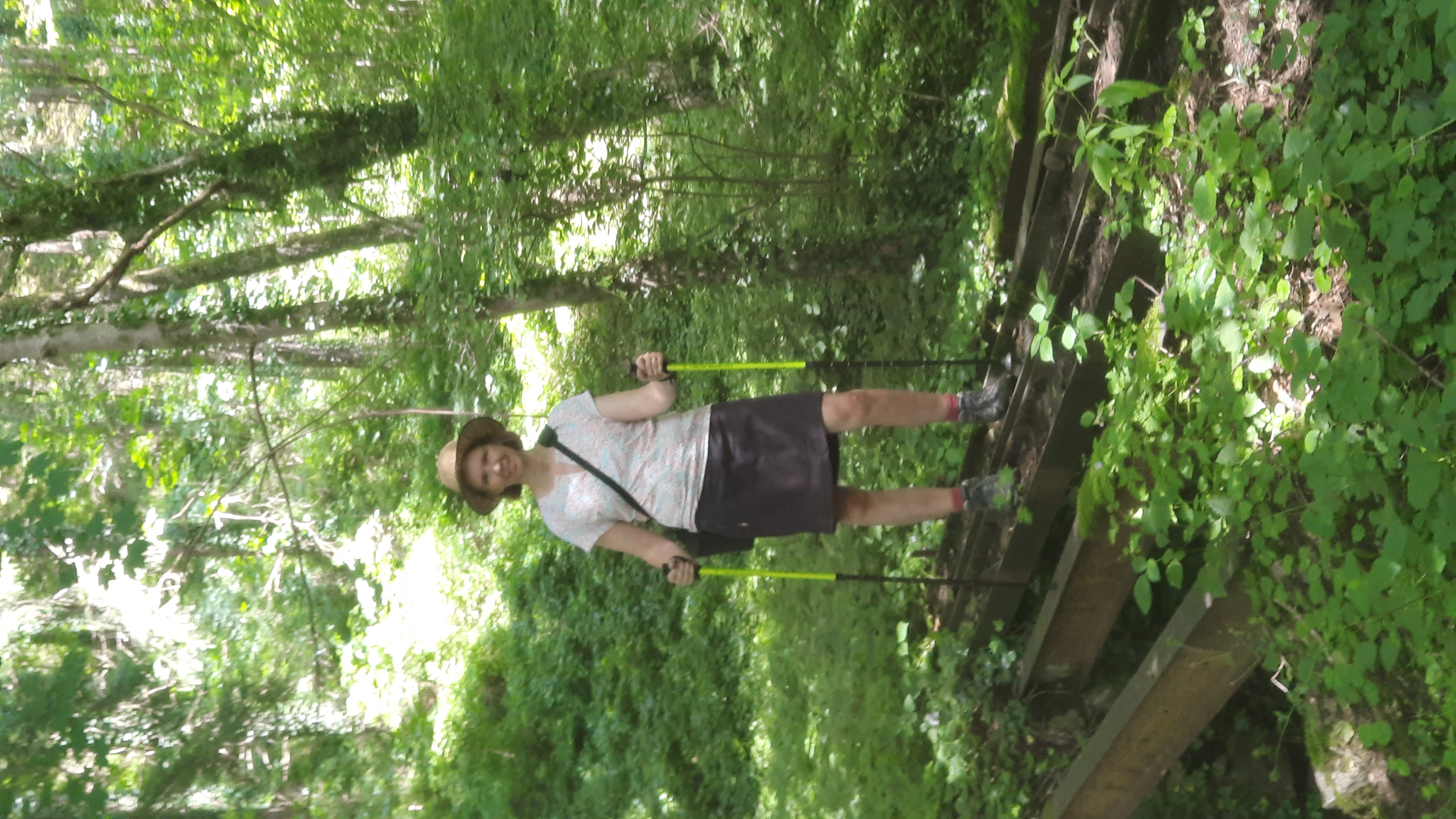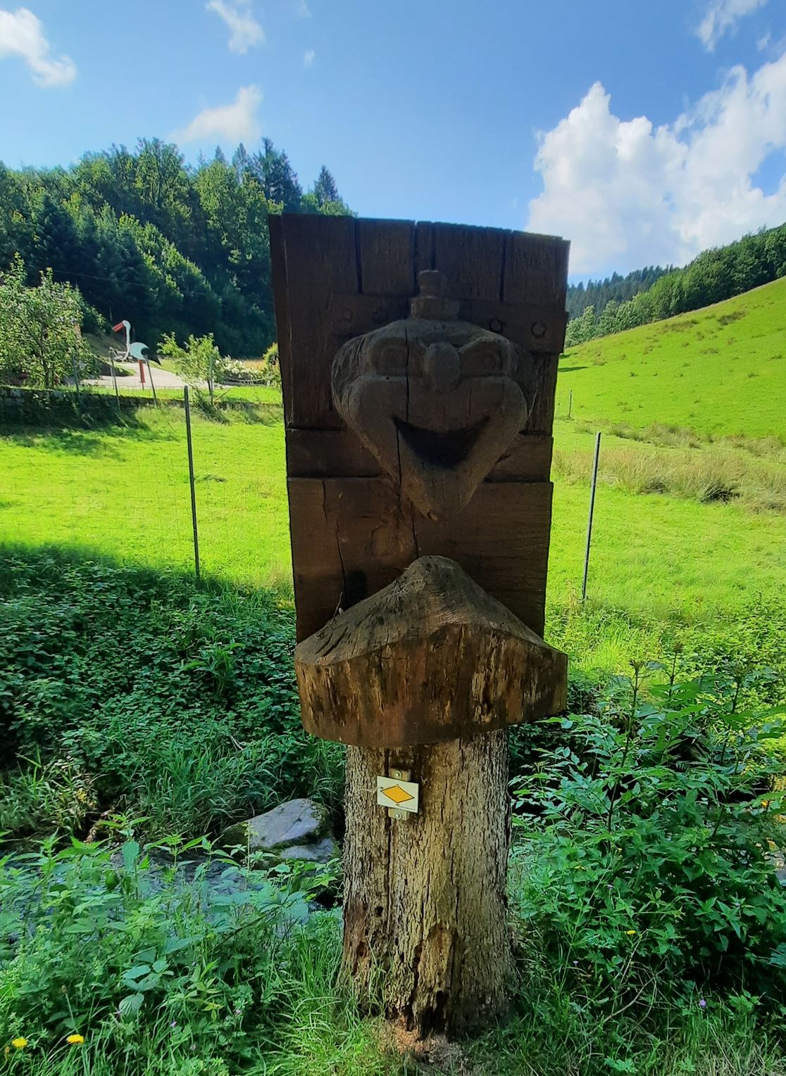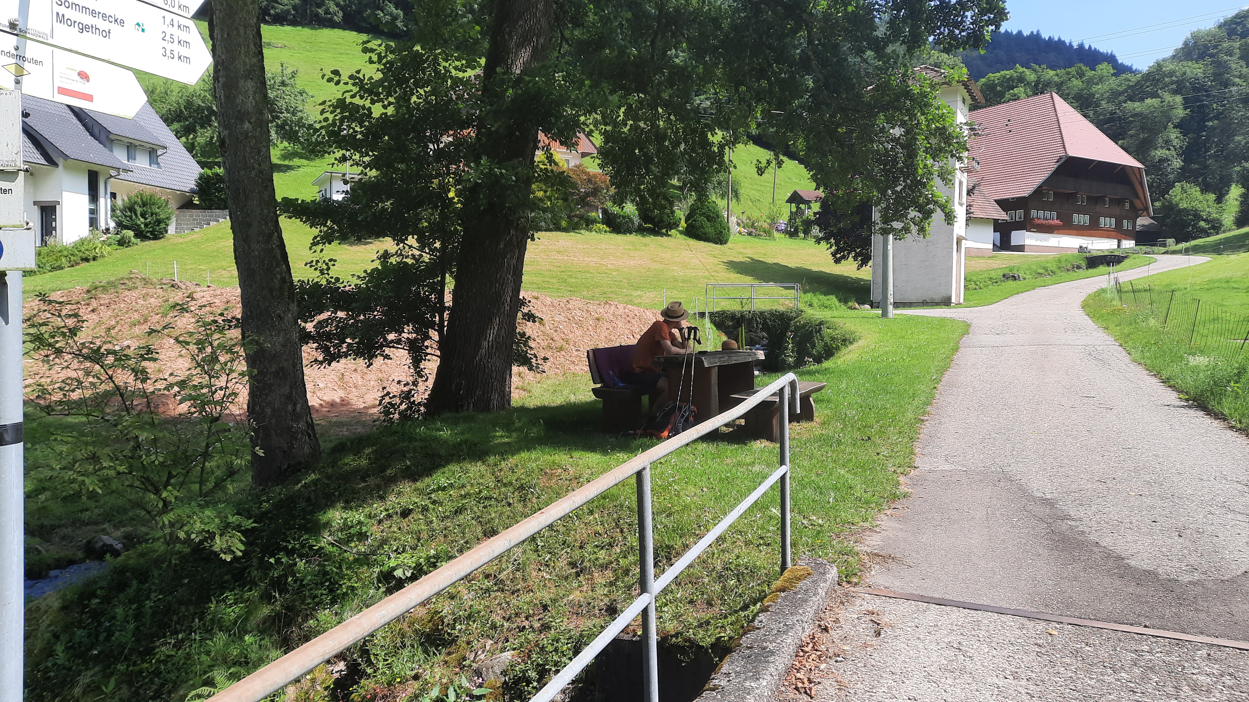 Onderweg hebben ze leuke houten beelden staan of een huisje waar je een borreltje kan pakken. De route loopt door Kirnbach en dan moeten gaan we omhoog een weide op. Maar eerst op een bankje geluncht. De baguette en een gedeelde appel. De route is hier niet vaak belopen, niet gemaaid. Dicht bebost, door de het gele spekje (route) weten we wel dat we goed lopen. Maar het voelt niet goed. We lopen nog wat door maar besluiten toch nog om te keren. We zien bij de beek wel een brug van metalen balken (foto) maar ook dit loopt dood. Dus we lopen dezelfde route terug naar de camping. Onderweg krijg ik (Miriam) last van mij knie, hopelijk doet een nachtje rust goed.
