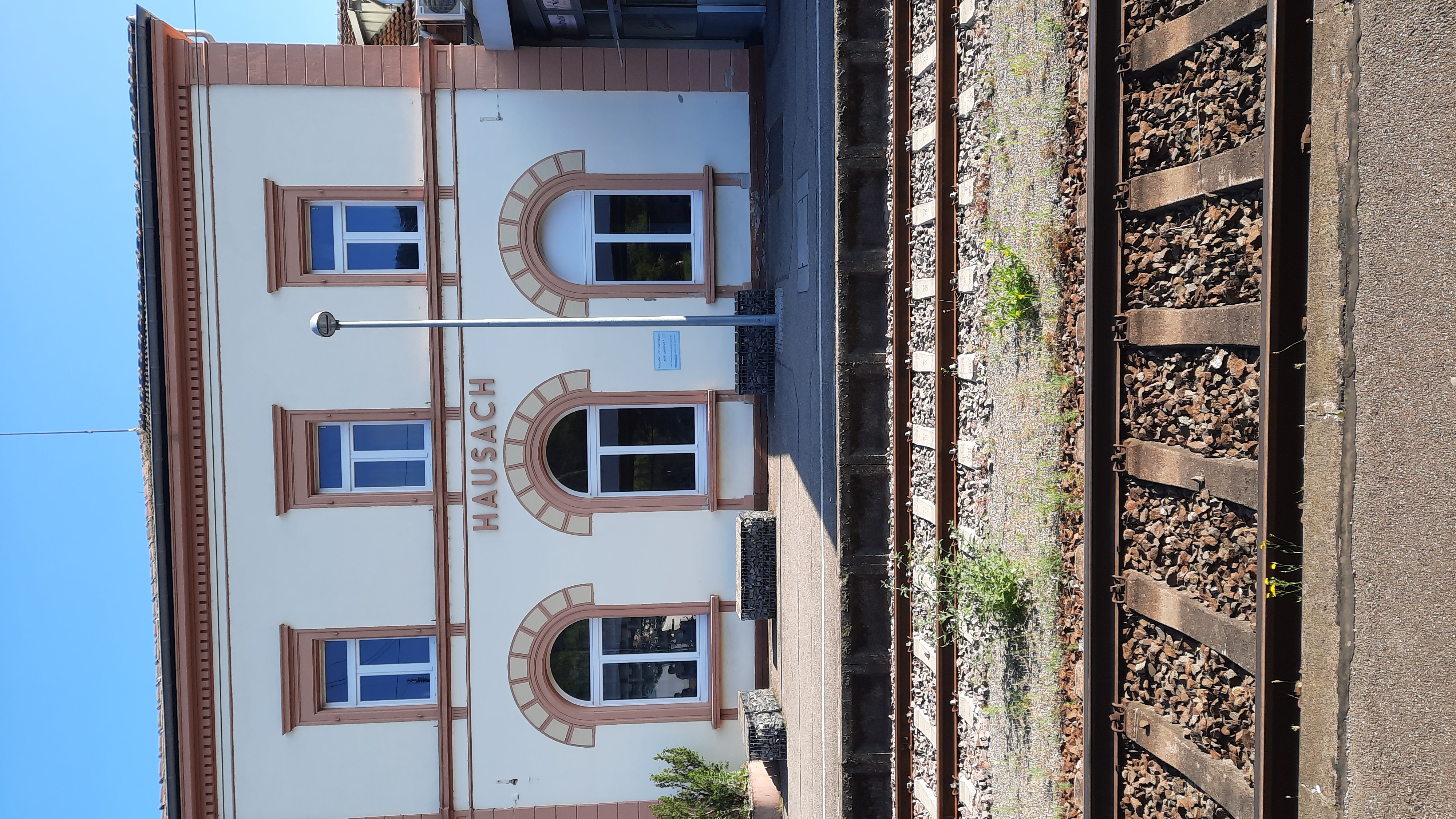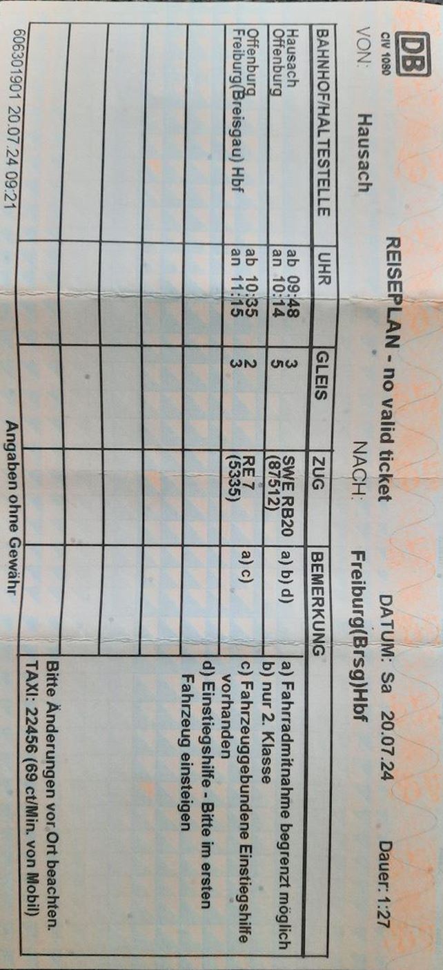 We rijden met de auto naar Hausach en zetten de auto bij het station neer. We kijken op het bord op welk spoor we moeten zijn maar dat is bij dit kleine station een beetje moeilijk te ontdekken. Dus we vragen het na en een aardige manier van het loket helpt ons daarbij. Bij de ticketautomaat kan je ook je reis inplannen om alleen een kaartje te krijgen waarop de aankomst en vertrek perrons op staan.