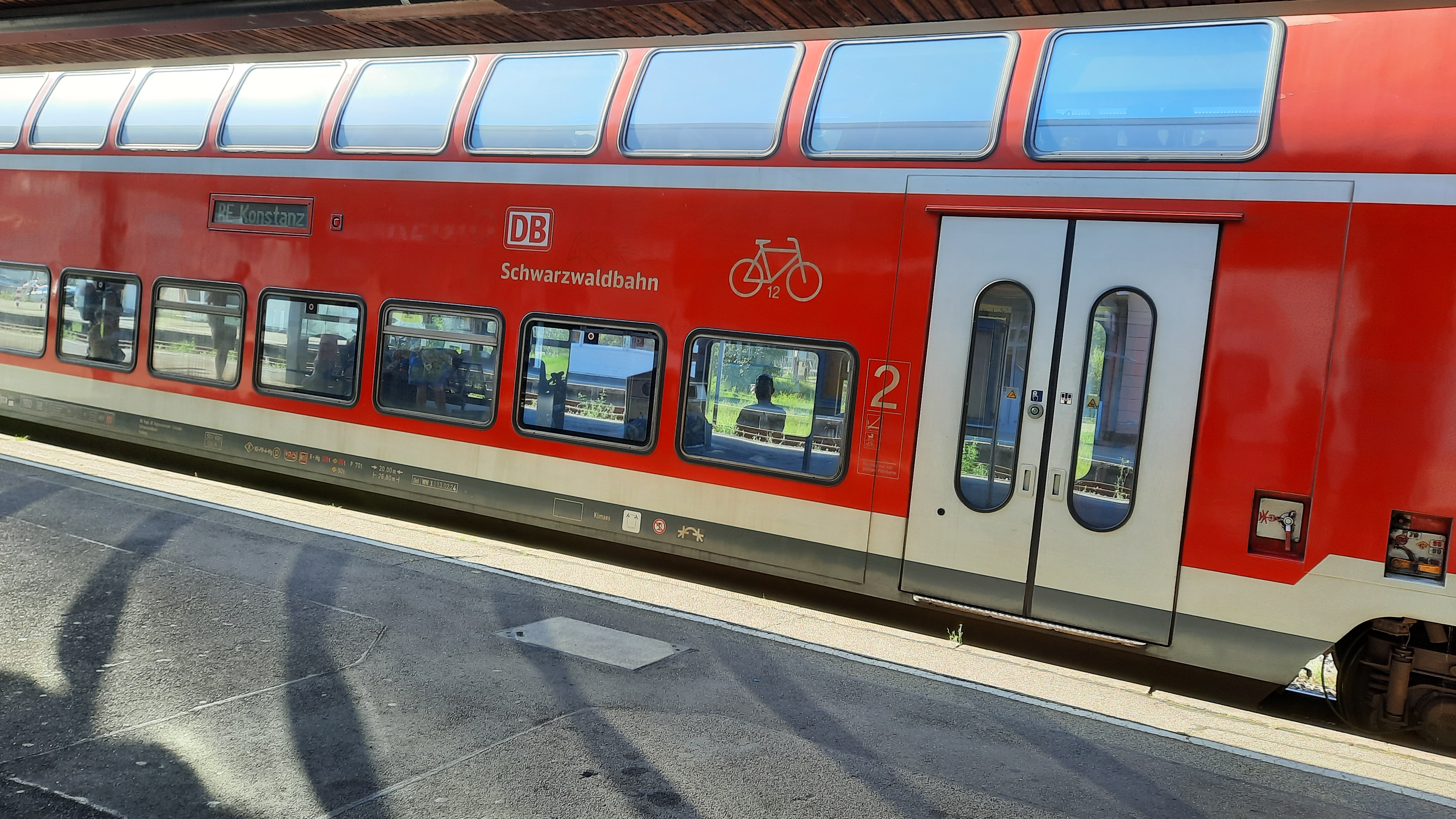 We moet aan de andere kant van het spoor zijn die we via een tunneltje bereiken. Het is al aardig druk in de trein, dus we vinden een plekje op zo’n opklapstoeltje in het halletje. We nemen de stoptrein naar Freiburg en moeten overstappen bij Offenbach. Met de meuten worden we de het perron afgeleid, maar in de drukte komen we op het verkeerde perron uit. Gelukkig komen we hier op tijd achter en komen net op tijd bij de juiste trein. We hebben nu een plek met z’n tweeën naast elkaar. Ook nu is de trein vol en hoe dichter we bij Freiburg komen hoe voller het wordt. Er staan nu zelfs mensen in het gangpad.