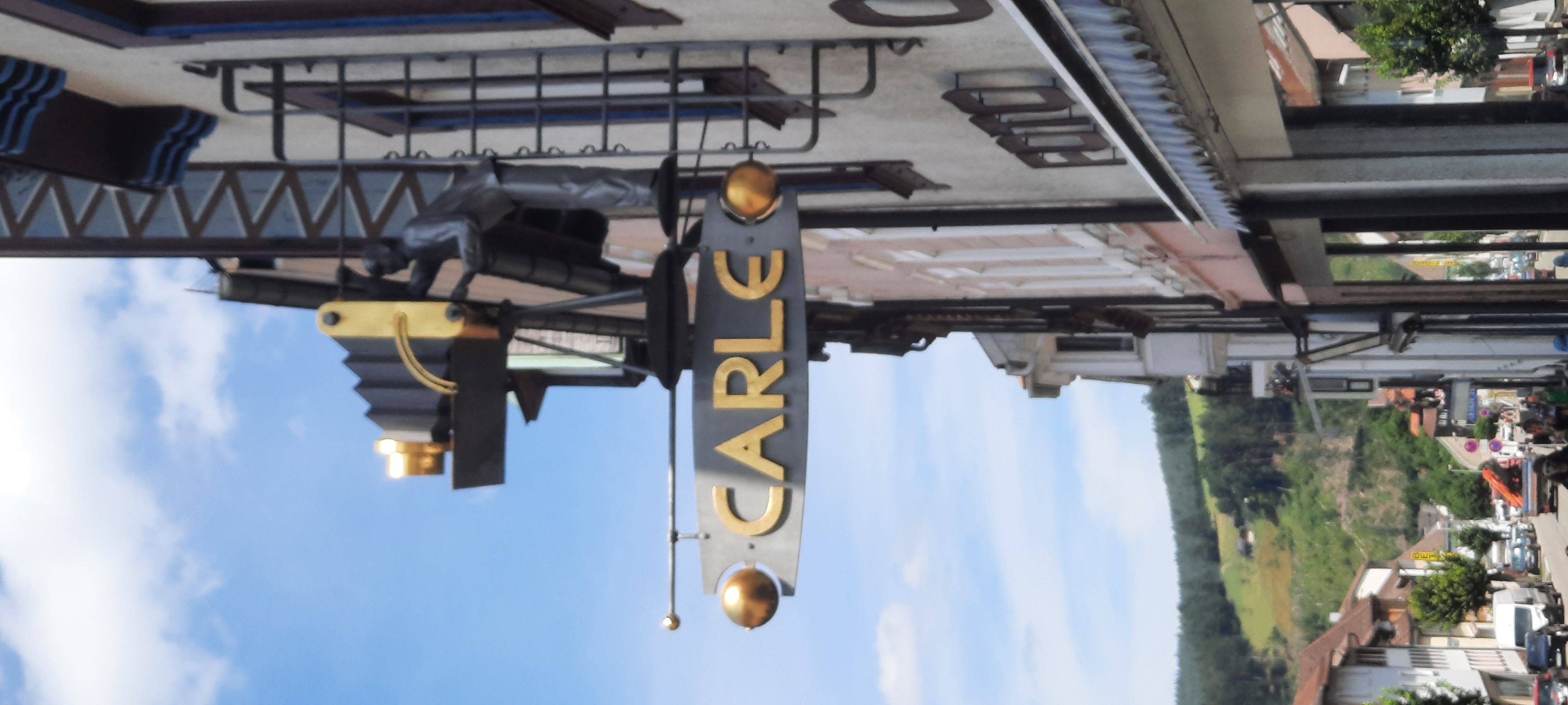 We keren om en gaan over een brug naar de andere kant en gaan via het bos weer omlaag. Terug bij de ingang gaan we bij een hotel lunchen, wauw er zijn hier gewoon terrasjes open. Zeer zeldzaam, waar je bij ons in ieder dorp bijna wel een terrasje ziet is alles hier gesloten. Als toetje een latte met een Schwarzwald Kirsch. Na ons buik gevuld te hebben lopen we terug naar het station, maken nog wat foto’s van grappige borden en bijzondere gebouwen en een grote locomotief.