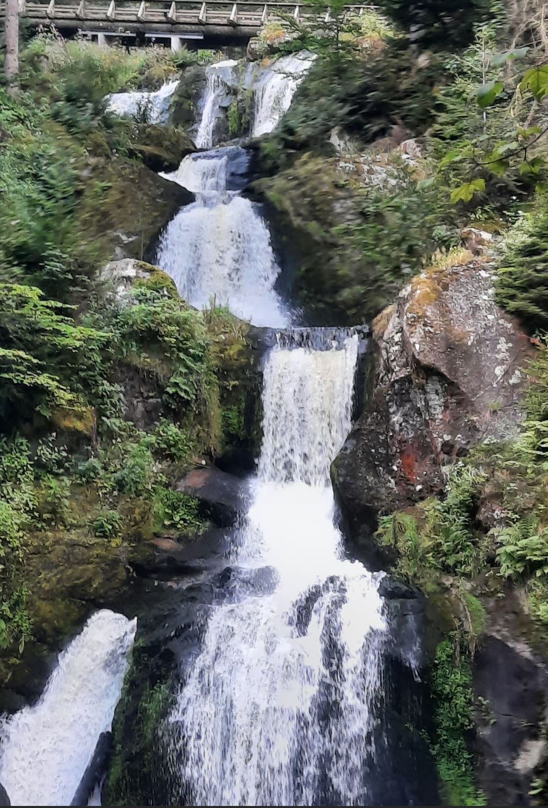 In slakkengang gaan we naar boven en we zien de watervallen. Om nou te zeggen jeetje wat hoog, want zo is de aankondiging. De watervallen bij Triberg zijn de hoogste van Duitsland. Maar als je al watervallen gezien hebt in Oostenrijk dan is dit echt wel een tegenvaller. Onderweg gaan we op een bankje zitten om een appeltje te eten. Even weg van de drukte. En dan ziet opeens iemand een eekhoorn en is de stilte weg. We worden omringd door mensen met fototoestellen en mobieltjes om een glimp op te vangen van de eekhoorn. Er worden nootjes gegooid. Ook komen er vogels op af, deze zijn zwart- wit, lijkend op kraaien. [Op de camping hebben we de vogel opgezocht en het is een gevlekte kauw]. Dus als we eenmaal de appels op hebben gaan we maar weer verder. Boven aan bij de watervallen moet je weer terug, want het pad loopt “dood”. Nou ja, je loopt eigenlijk het park weer uit.