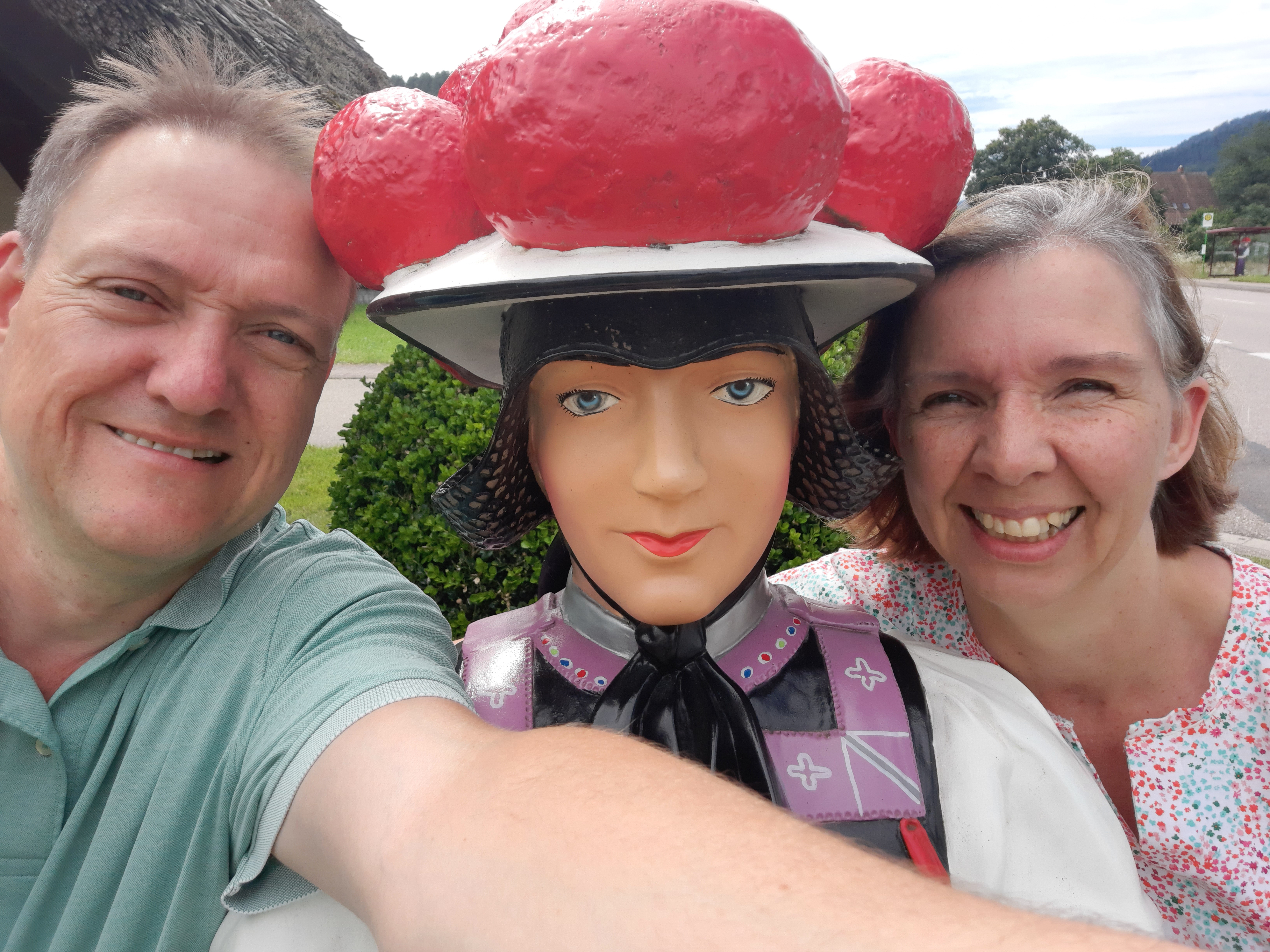 We stappen lekker op de fiets en gaan een stuk rijden. Dan zien we het bordje Gutach, we weten van het zien uit de trein dat hier een openluchtmuseum en een roddelbaan is. Dus daar fietsen we naar toe. Onderweg komen we een mooie vlag tegen met alle zintuigen erop “Park mit Allen Sinnen”. Hier kan je ook heerlijk ijs eten en dat doen we dan ook. Dan fietsen we verder over het mooie fietspad dat leidt ons naar Hornberg. Onderweg zien we “Beppie” zitten met wie we samen op de foto gaan.