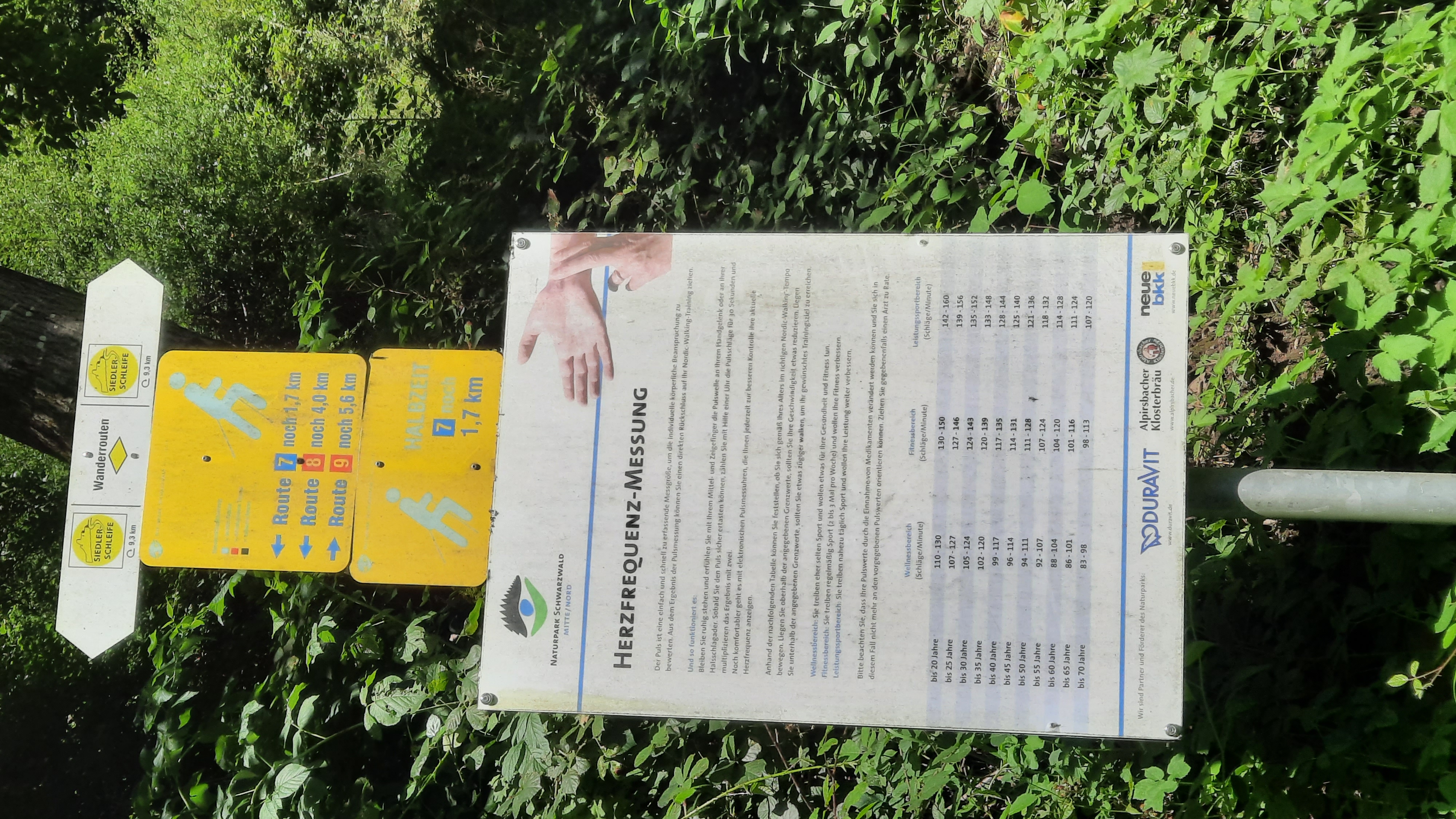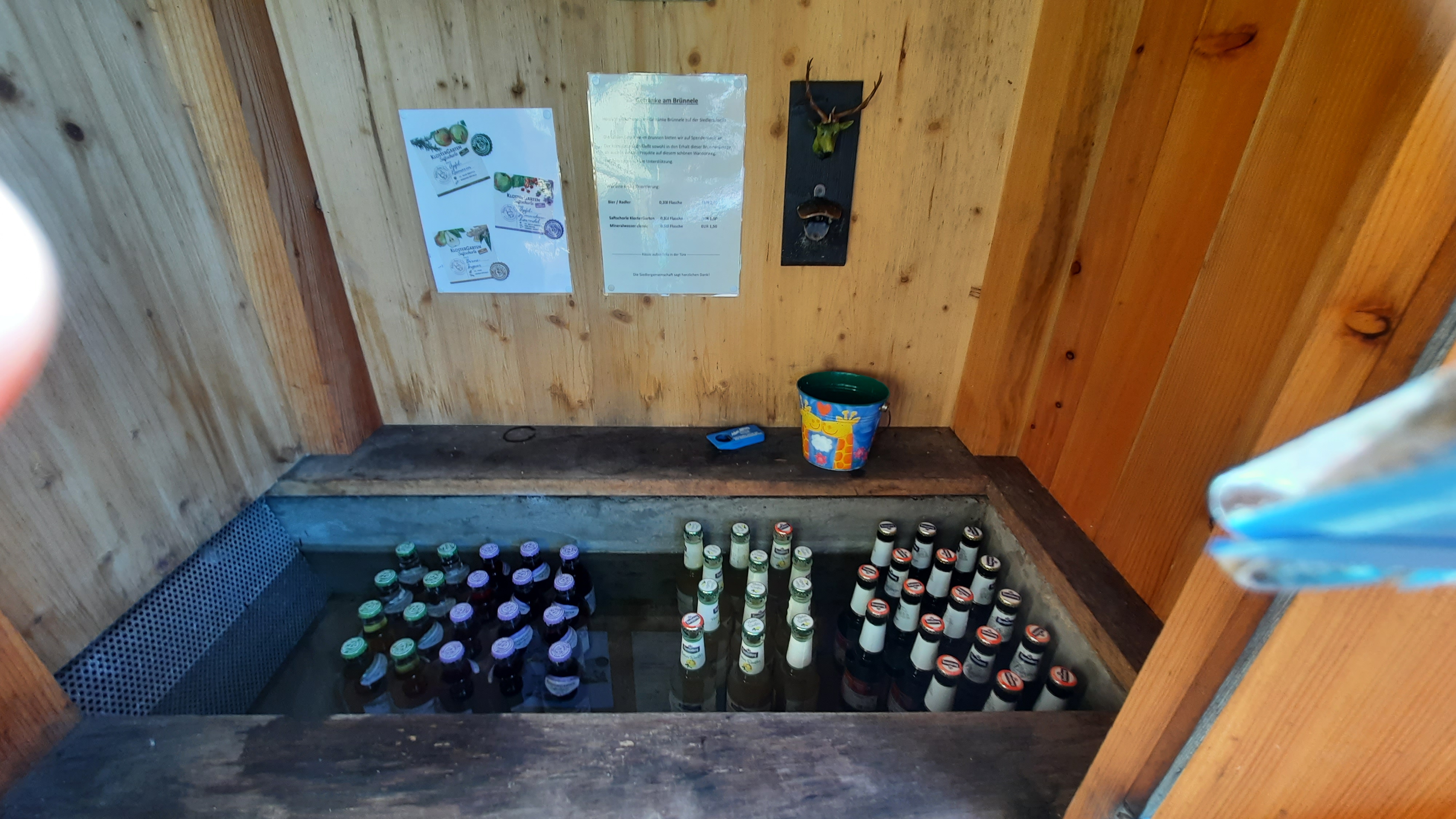 Dan komen we in het bosgedeelte. Heerlijk in de schaduw. Om de zoveel meter is er wel een bankje, maar als we deze iedere keer gaan gebruiken, duurt de wandeling van 6,9 km wel erg lang. Het is een leuke route met leuke bezienswaardigheden zoals een uitzichtpunt met een lounge bank, een mini bad om je voeten te koelen of een kast waar fris en 0% radler koel staan in koud bronwater.