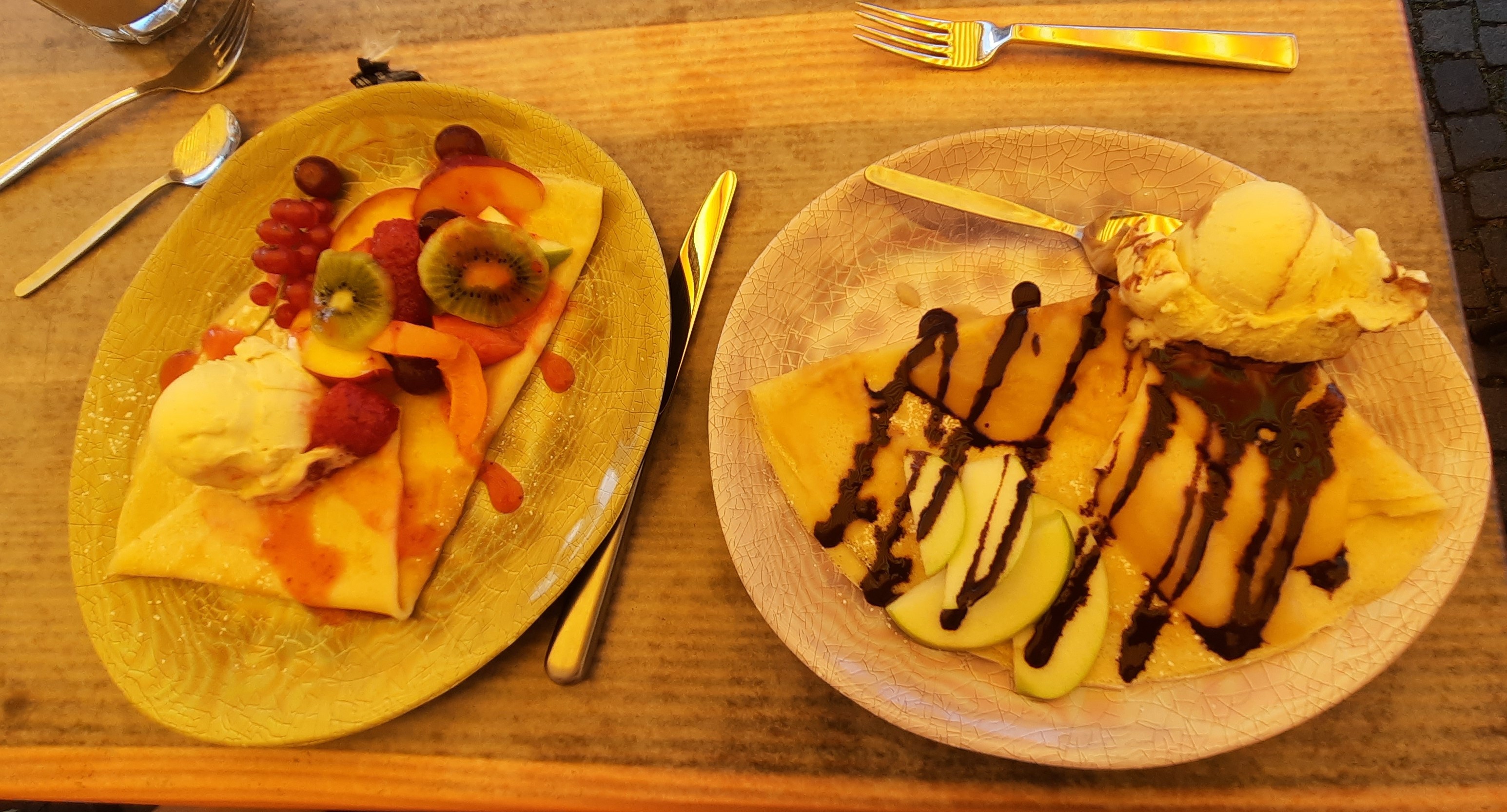 In Gengenbach bestellen we op een terrasje bij een ‘backerei’ twee latte’s en twee crêpes. Miriam heeft een crêpe met appel en chocolade en een bolletje ijs, Han een crêpe met vruchten en ook een bolletje ijs.