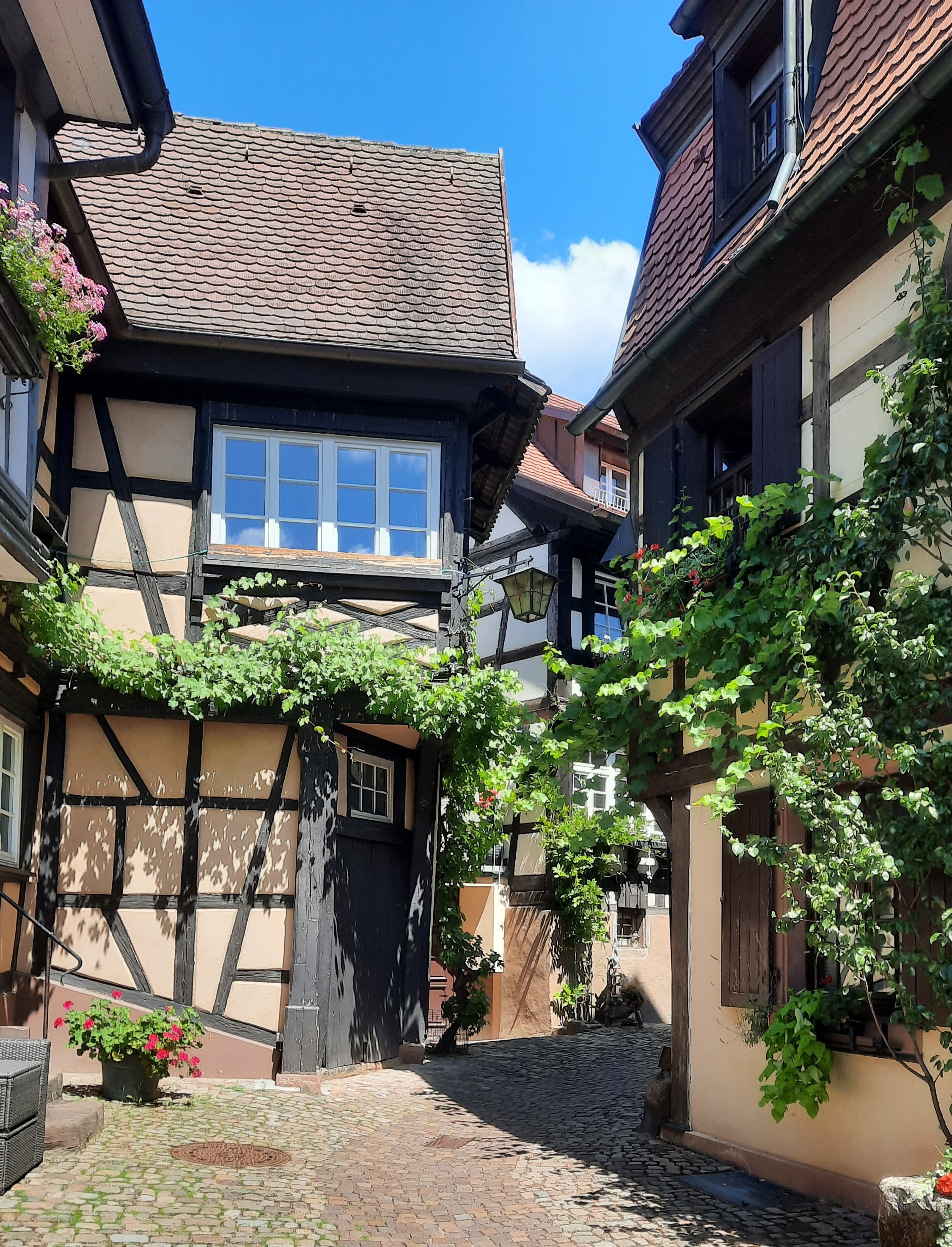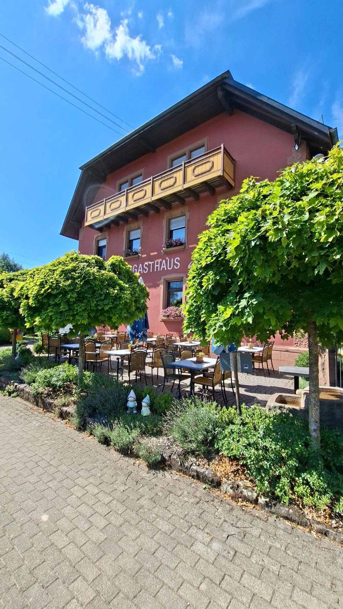We lopen terug richting de fietsen en besluiten nog een colaatje te drinken op een terrasje. Dan fietsen we weer terug naar de camping, weer 31km, maar nu wat meer omhoog. We maken ook nog een foto van het “boerderijterras” waar we vorig jaar Sam van de gezellige camping tegenkwamen. Verder hebben we veel ooievaars gezien die op de termiek aan het meeliften. Op de terugweg doen we in Haslach nog wat boodschappen bij een Rewe. Hier hebben we vorig jaar ook al een keer boodschappen gedaan.
