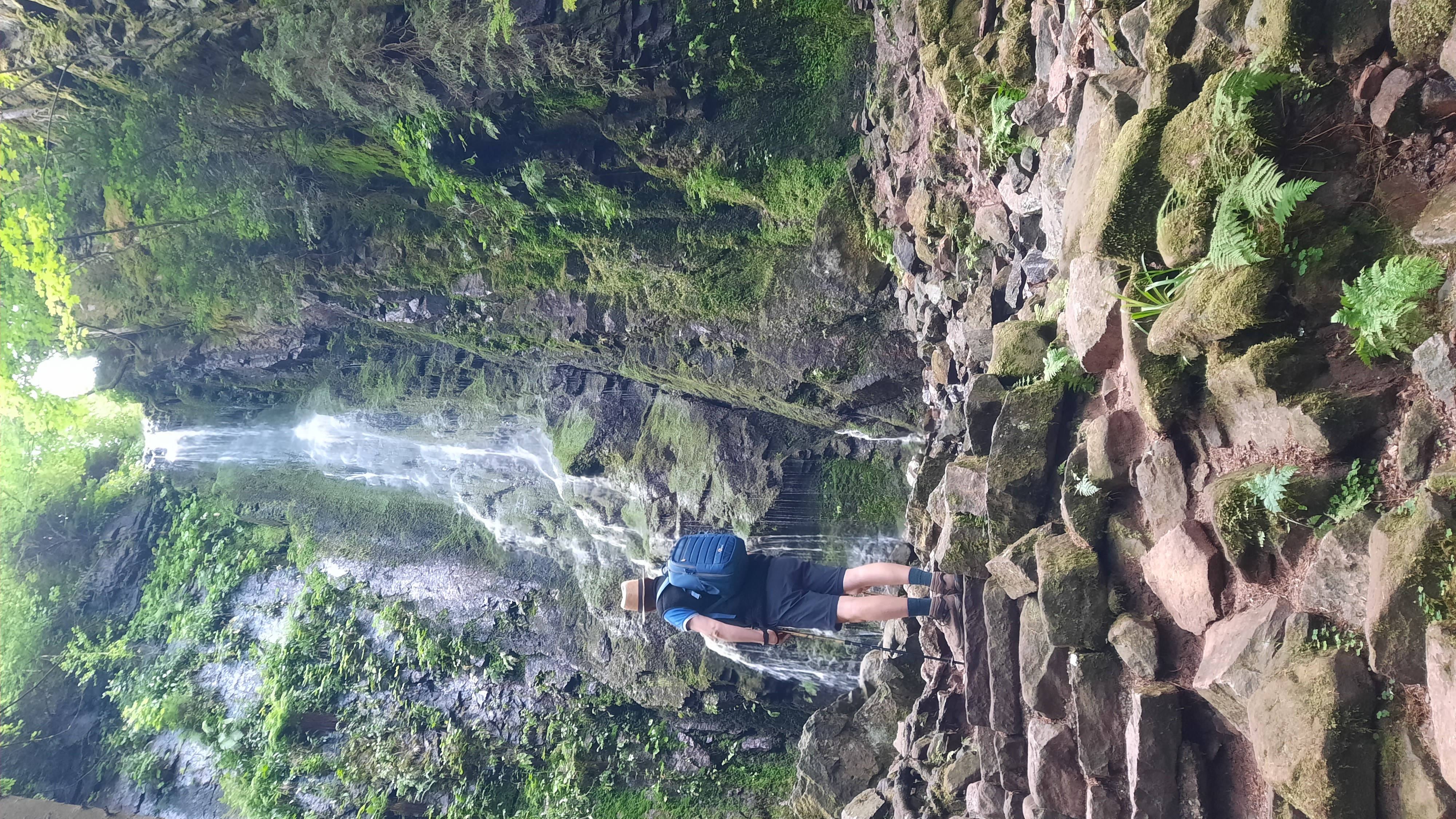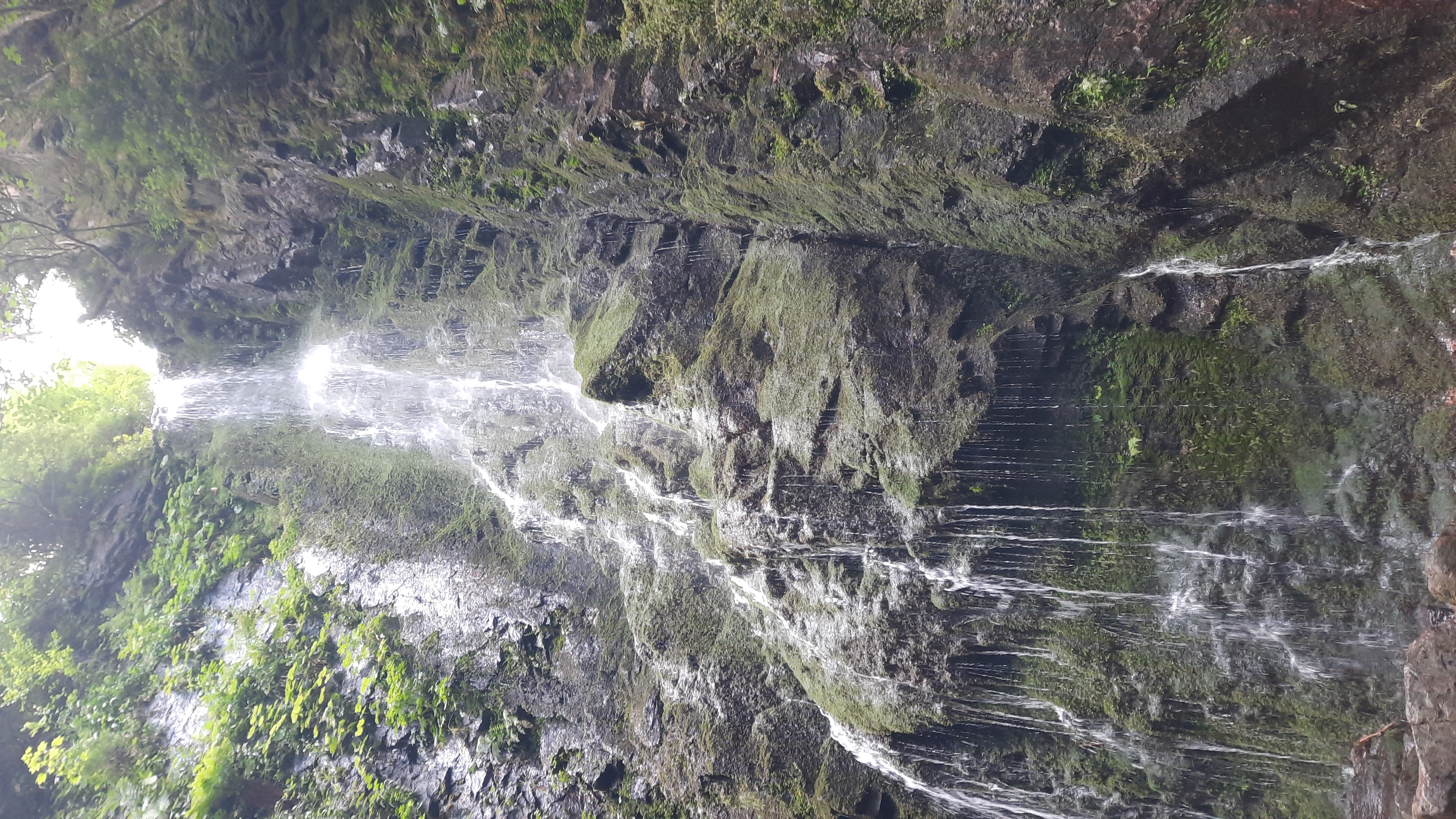 We gaan van het weggetje af en belopen een smal pad omhoog de bossen in. Het is even wandelen en na ongeveer één kilometer hoor je de waterval al. Eerst kom je een drankhuisje tegen en aan het einde van het pad ga je linksaf. Een stukje verder zie je de waterval ook. Wat een mooi natuurverschijnsel. We maken wat foto’s en dan lopen we een stukje terug. Het wandelbordje stuurt ons verder omhoog, het is een stijl pad dat al slingert de top bereikt. We zijn bij een uitkijktoren beland aan de linkerkant. Het trappetje af en dan rechts bevindt zich nog een picknick plaats.