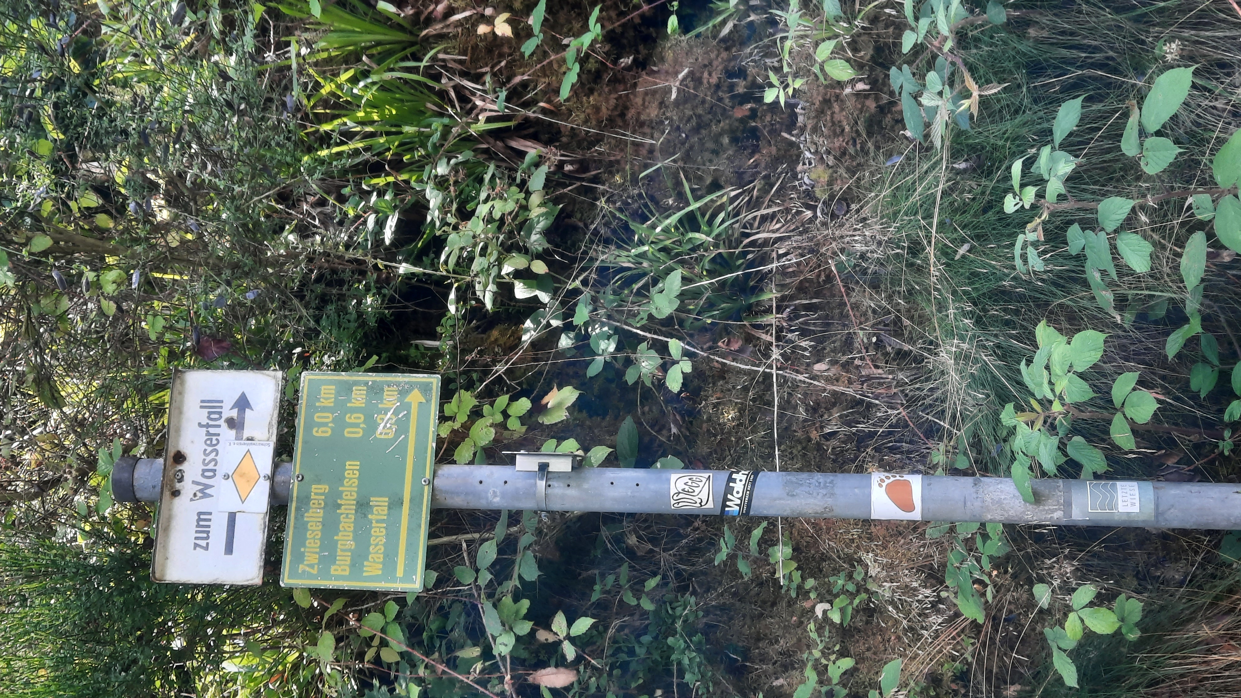 We rijden naar het plaatsje Burgbach. Daar is een mooi stukje natuur met een waterval. Beneden langs de autoweg is een parkeerplaats voor de auto. We wandelen eerst een stuk omhoog langs huizen en dan zien we dit bordje aan de rechterkant.